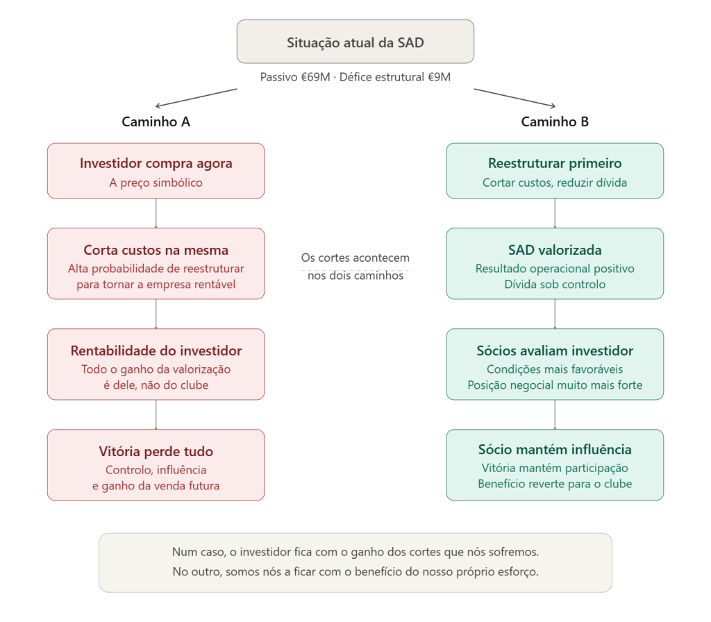 O mais provável seria um investidor fazer exatamente aquilo que alguns sócios consideram doloroso e que querem evitar: cortar custos. Criar sinergias com outras empresas ou clubes que já tenha. Nenhum investidor iria manter um possível défice e prejuízo estrutural de 9 milhões. O investidor pretende obter lucro, não perdas para alimentar o sonho de sócios. Essa é a dura realidade.