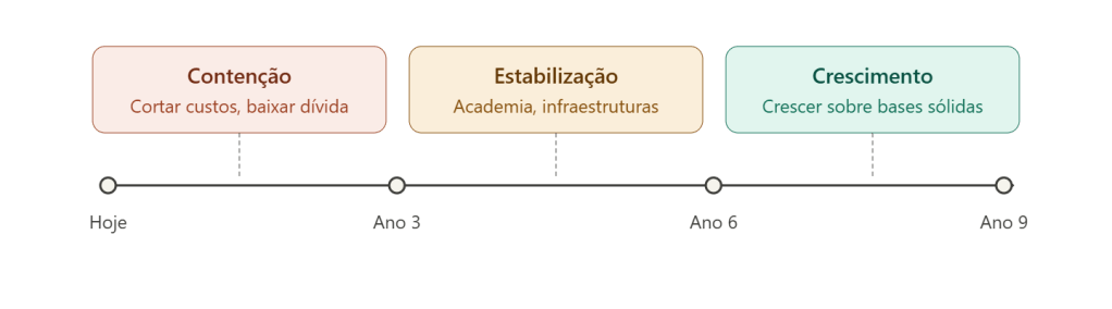 Se fizermos este caminho agora temos a possibilidade de em 3 anos recuperar, em 6 anos estabilizar e em 9 anos crescer em relação aquilo que temos hoje. Muitos dirão que não querem esperar, mas não tenho dúvidas que é a melhor hipótese de sucesso. Afinal, que sucesso tivemos nos últimos 9 que não mereça tentar?